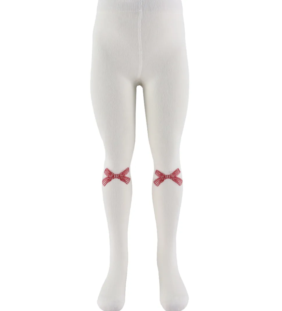 Skønne Name It strømpebukser solgt i en 2-pak, der indeholder et par i rød med rensdyrmotiver på knøene og et par i hvid med små røde sløjfer på knæene. Begge strømpebukser har elastik i taljen, som giver en god pasform.