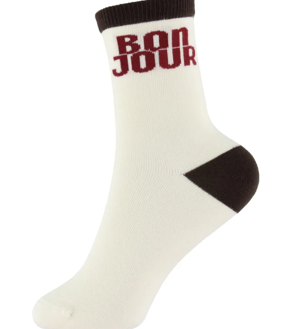 Stilfulde Name It strømper i en 3-pak med farverne blå, lyseblå og hvid. Strømperne har et retromønster med tekst “BONJOUR” på det hvide par. Name It strømperne har en smal ribkant øverst, som sikrer en god pasform. Disse strømper kombinerer et klassisk look med moderne detaljer.