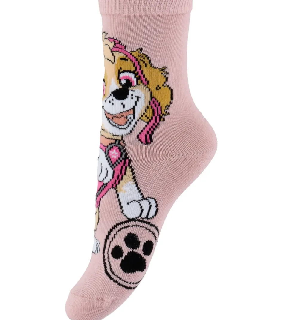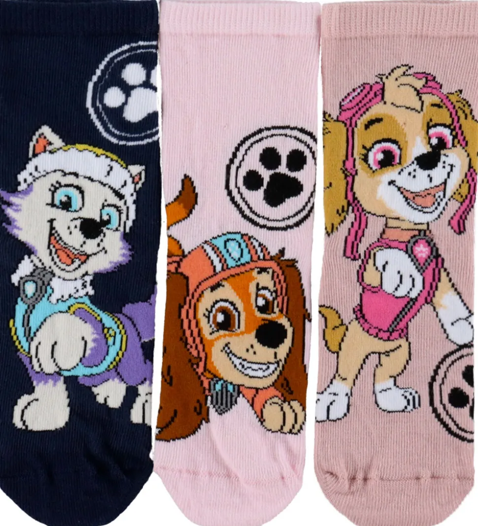 Charmerende Name It strømper i en 3-pak med designs i lyserød, mørkeblå og mørkerosa, prydet med motiver af forskellige karakterer fra Paw Patrol.