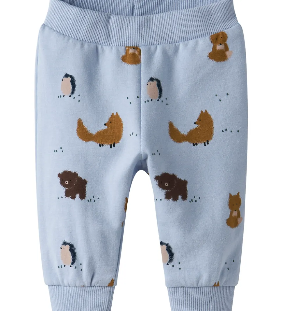 Charmerende sweatpants fra Name It i lyseblå med print af søde dyr. Sweatpantsene har en god elastik i taljen, som kan justeres med knapper indvendigt. De har ribkanter ved anklerne, og indvendigt er der blødt, børstet bomuld.