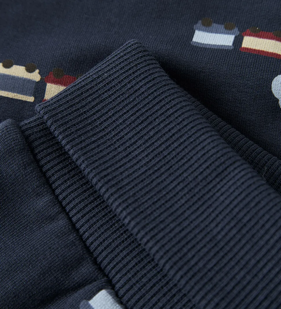 Lækre Name It sweatpants i navyblå med et alloverprint af toge i forskellige farver. Sweatpantsene har en bred ribkant i taljen, som kan bukkes ned. I benåbningerne er der ribkanter, og indvendigt er der blødt, børstet bomuld.