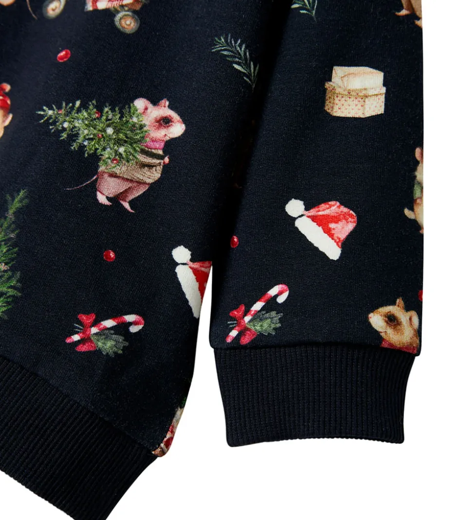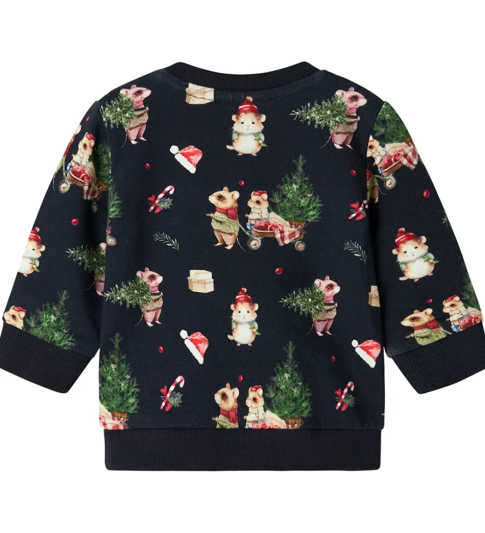 Charmerende Name It sweatshirt med et sødt juleprint af små dyr, der bærer juletræer. Sweatshirten kommer i en navy nuance og har lange ærmer samt en rund halsudskæring.