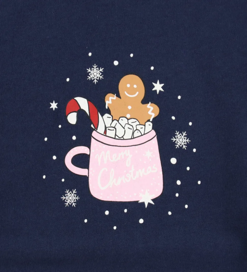 Charmerende Name It sweatshirt i navyblå med et juleprint på fronten af en rosa kop med skumfiduser en slikstok og en peberkagemand på toppen. Name It sweatshirten har lange ærmer og en rund hals, der giver et tidløst udtryk. Indvendigt er der blødt, børstet bomuld.
