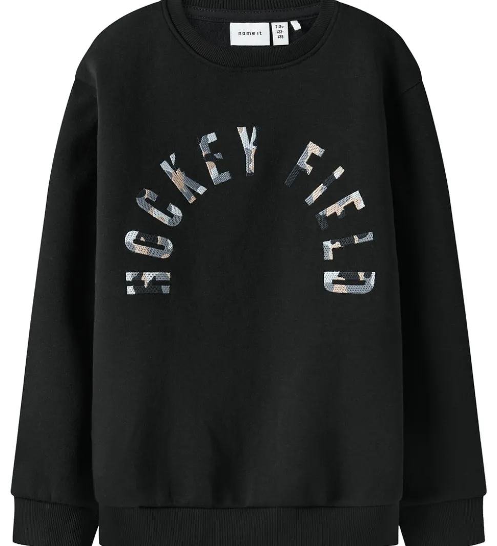 Moderne Name It sweatshirt i sort med teksten “Hockey Field” på forsiden i camouflageprint i blå og brun. Sweatshirten har lange ærmer og en rund halsudskæring. Den har ribkanter ved alle åbninger, og indvendigt er der blødt, børstet bomuld.
