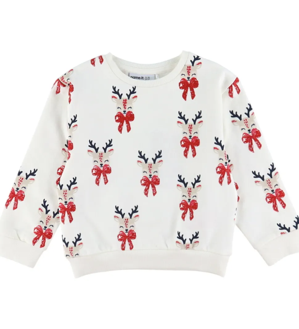 Charmerende Name It sweatshirt i hvid med et festligt print af rensdyr med røde sløjfer om halsen. Name It sweatshirten er designet med en rund halsudskæring og lange ærmer, hvilket tilføjer et klassisk udtryk. Indvendigt er der blødt, børstet bomuld.