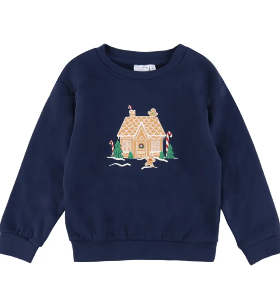 Charmerende Name It sweatshirt i navyblå med et jule-print på fronten af et honningkagehus. Name It sweatshirten har lange ærmer og en rund halsudskæring, som giver et enkelt og pænt udtryk. Ribkanter på ærmer og talje fuldender det klassiske design. Indvendigt er der blødt, børstet bomuld.