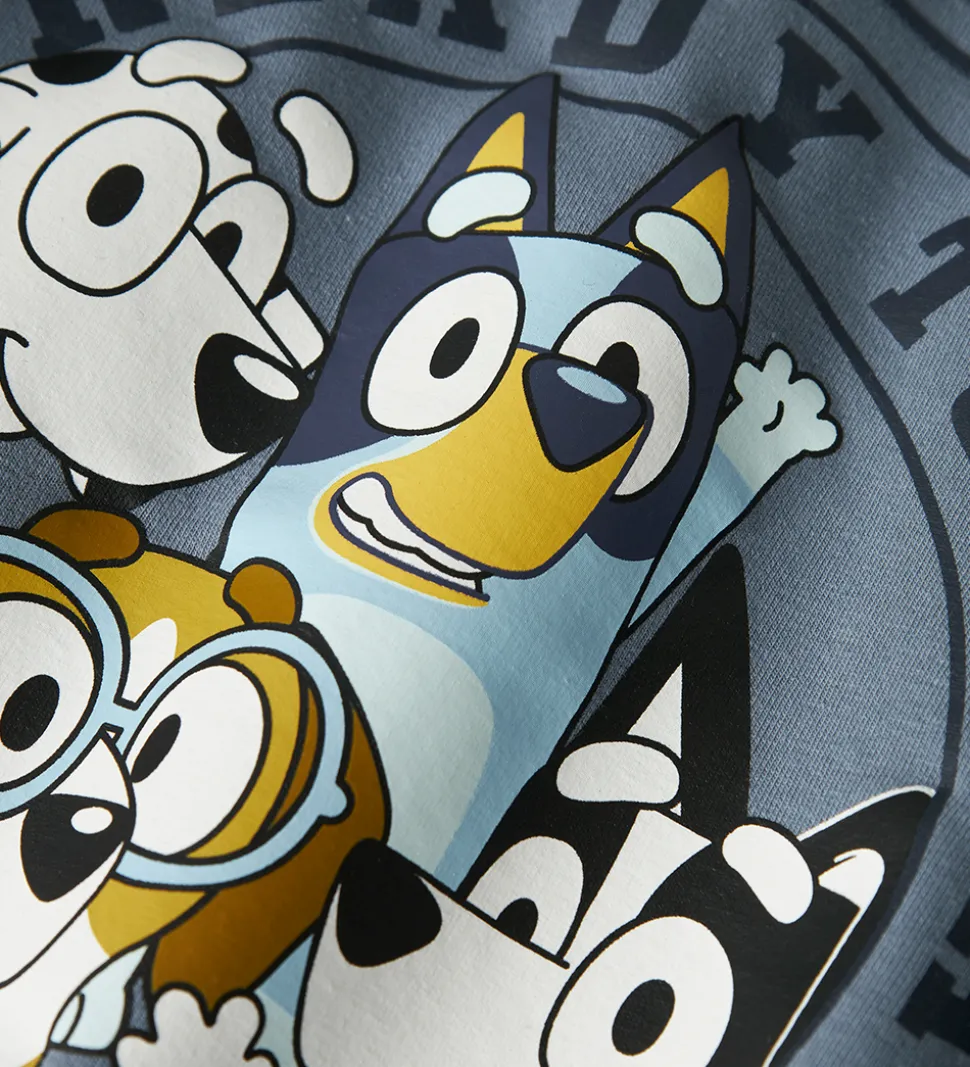 Flot Name It sweatshirt i støvet blå med et stort, farverigt Bluey-print foran. Sweatshirten har ribkanter med sorte kontraststriber ved hals-, ærme- og taljeåbning. Indvendigt er de blødt, børstet bomuld.