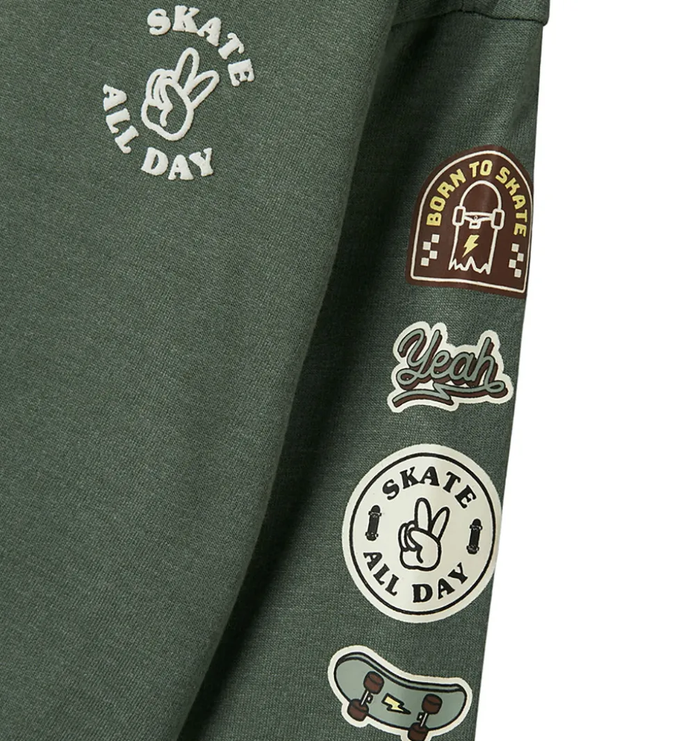 Sej Name It sweatshirt i støvet grøn med teksten “Skate All day” på venstre bryst og smarte skatermærker på venstre ærme. Sweatshirten har en rund halsudskæring og lange ærmer med ribkanter ved alle åbninger. Indvendigt er der blødt, børstet bomuld.