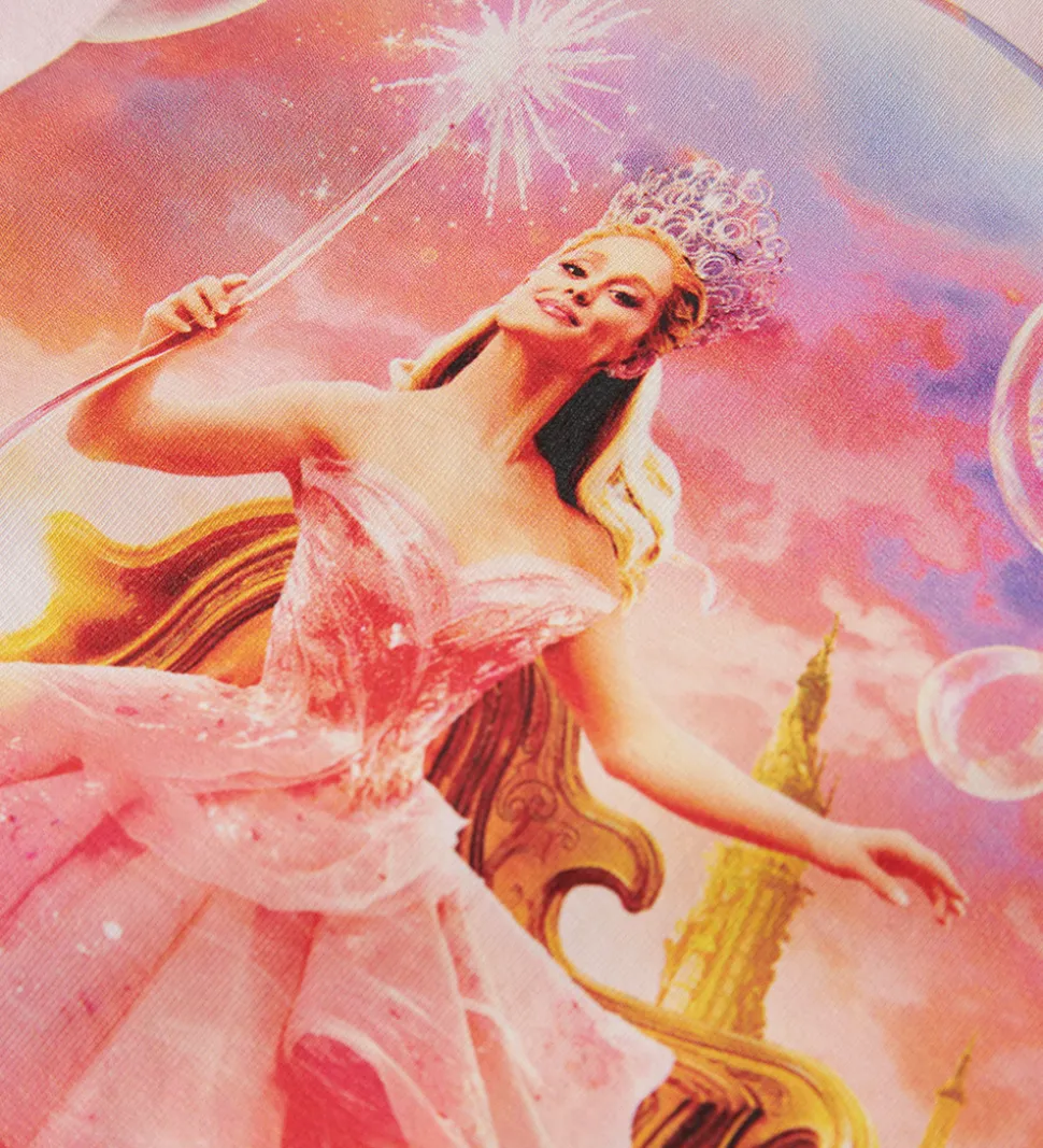 Charmerende Name It t-shirt i en lyserød nuance med et stort, farverigt fotoprint af en figur fra Wicked med en glitrende kjole og en dekorativ baggrund fyldt med bobler. Under printet står teksten “WICKED” i fremtrædende, lyserøde bogstaver med glittereffekt. Name It t-shirten har en klassisk rund halsudskæring med en fin ribkant.