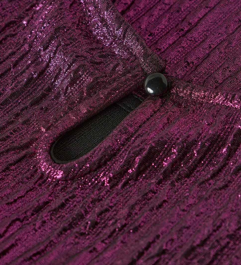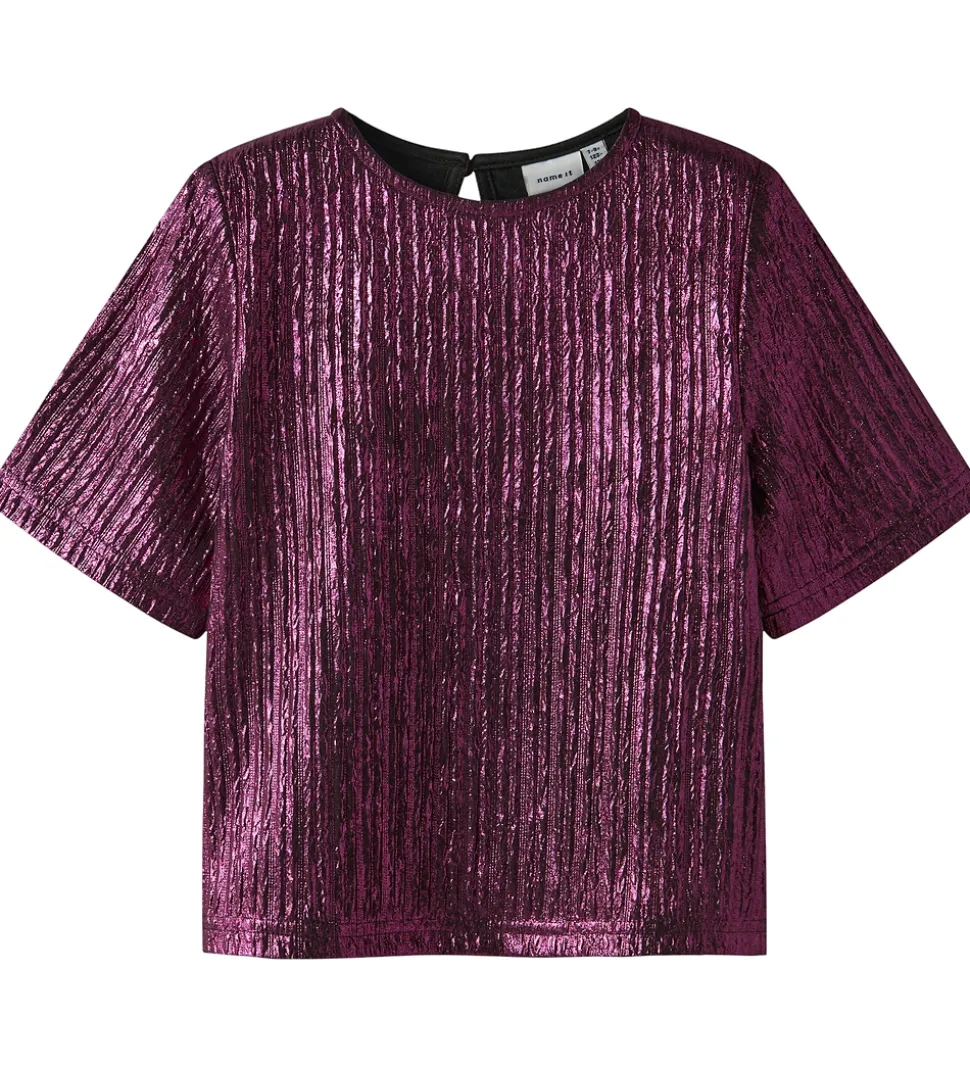 Smuk Name It t-shirt i en iøjnefaldende metallisk lilla. T-shirten har en elegant struktur med lodrette linjer, der skaber et raffineret udtryk. Name It t-shirten er designet med en rund halsudskæring og korte ærmer, hvilket giver en klassisk og enkel stil.