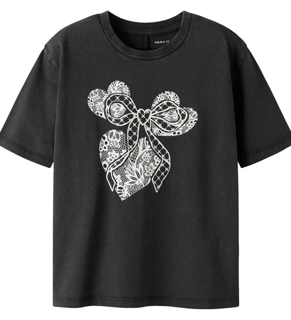 Elegant Name It t-shirt i en klassisk, sort farve. T-shirten prydes af et detaljeret, hvidt mønster med blonder, der forestiller en sløjfe og hjerter på forsiden. Denne Name It t-shirt har en rund halsudskæring og korte ærmer.