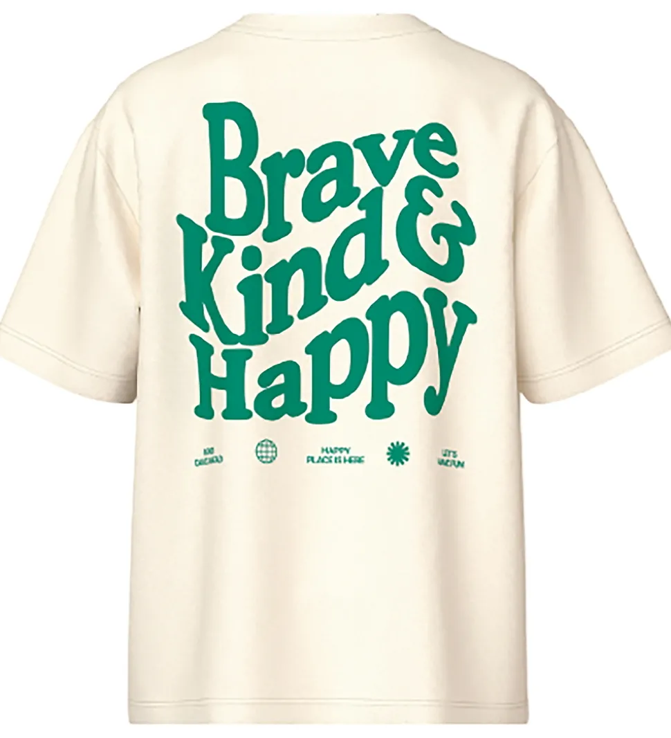 Smart Name It t-shirt i beige med teksten “Brave, Kind & Happy” i grøn på venstre bryst samt på ryggen. Name It t-shirten har en rund halsudskæring med en smal ribkant og korte ærmer.