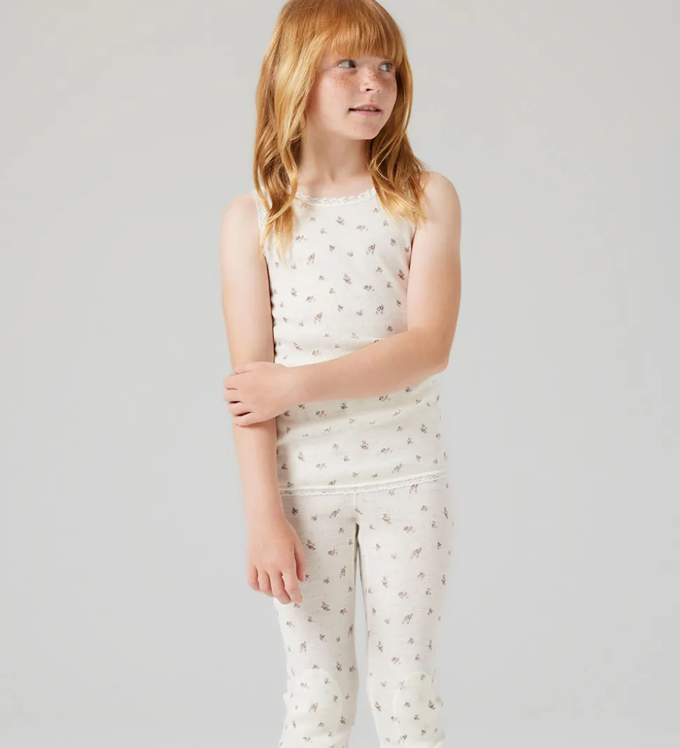 Elegant Name It undertrøje i råhvid med et fint, småblomstret mønster. Undertrøjen har en blød struktur og fine kanter ved halsudskæringen. Name It tilbyder her et design med et subtilt print, der tilføjer et stilfuldt touch. Undertrøjen er fremstillet af lækkert merinould.
