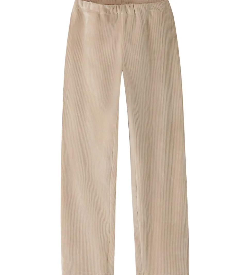 Stilfulde Name It velourbukser i en varm, beige nuance med diskrete, lodrette striber. Name It velourbukserne er udstyret med en elastisk talje, der sikrer en god pasform. Benenes afslutning er lige og elegant, hvilket understreger et moderne look i velourbukserne.