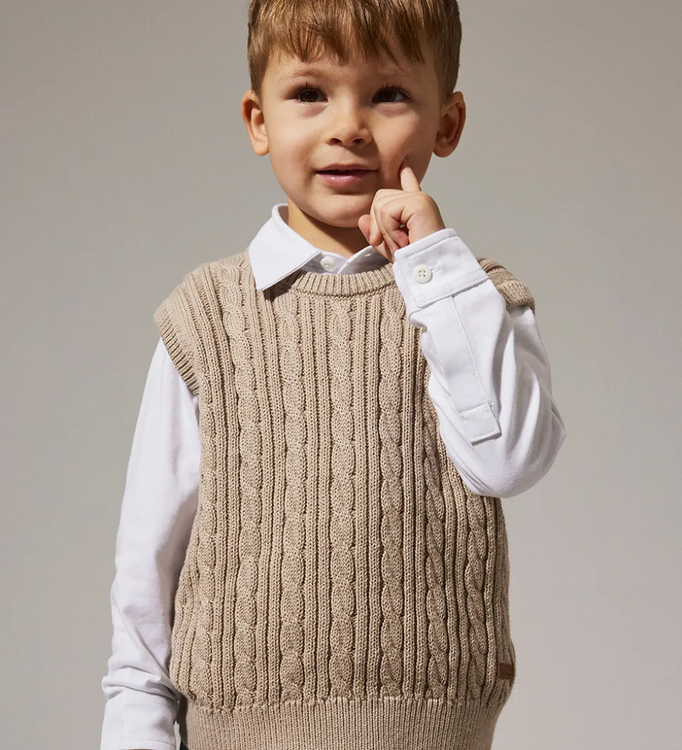 Sej Name It vest i beige. Name It vesten har et klassisk kabelstrikket mønster, og ribkanter langs alle åbninger.