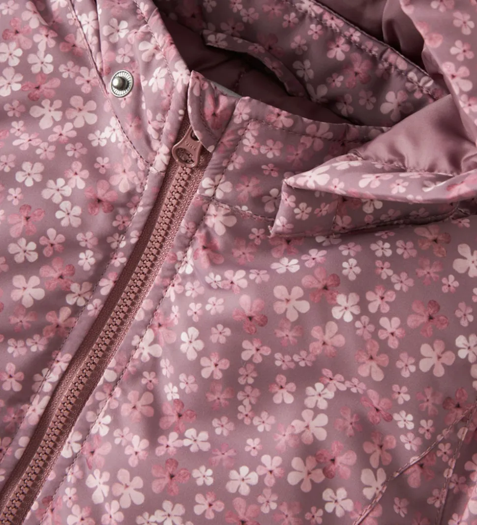 Smuk Name It vinterjakke i en fin lilla farve med et flot blomsterprint i lyserøde og hvide nuancer.