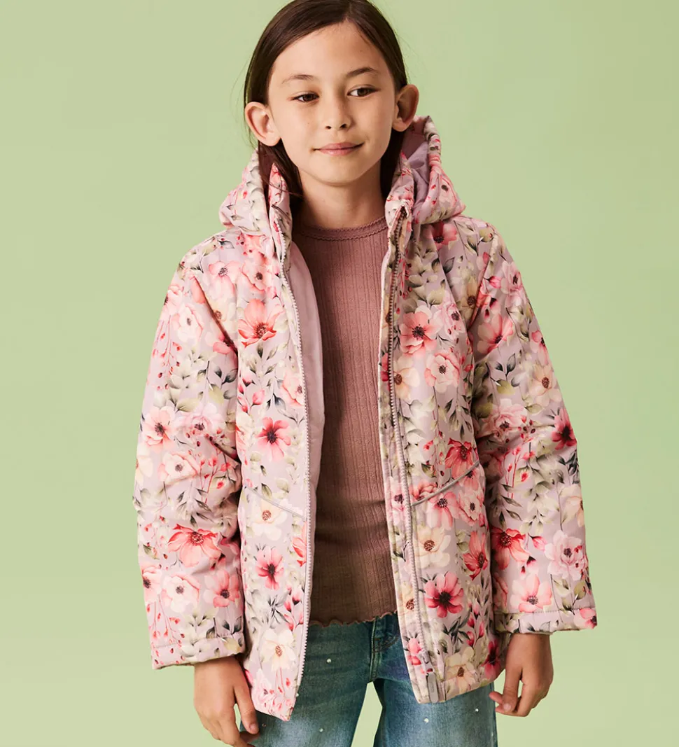 Smart Name It vinterjakke i en lys, lilla nuance med et smukt blomsterprint i rosa og grønne nuancer
