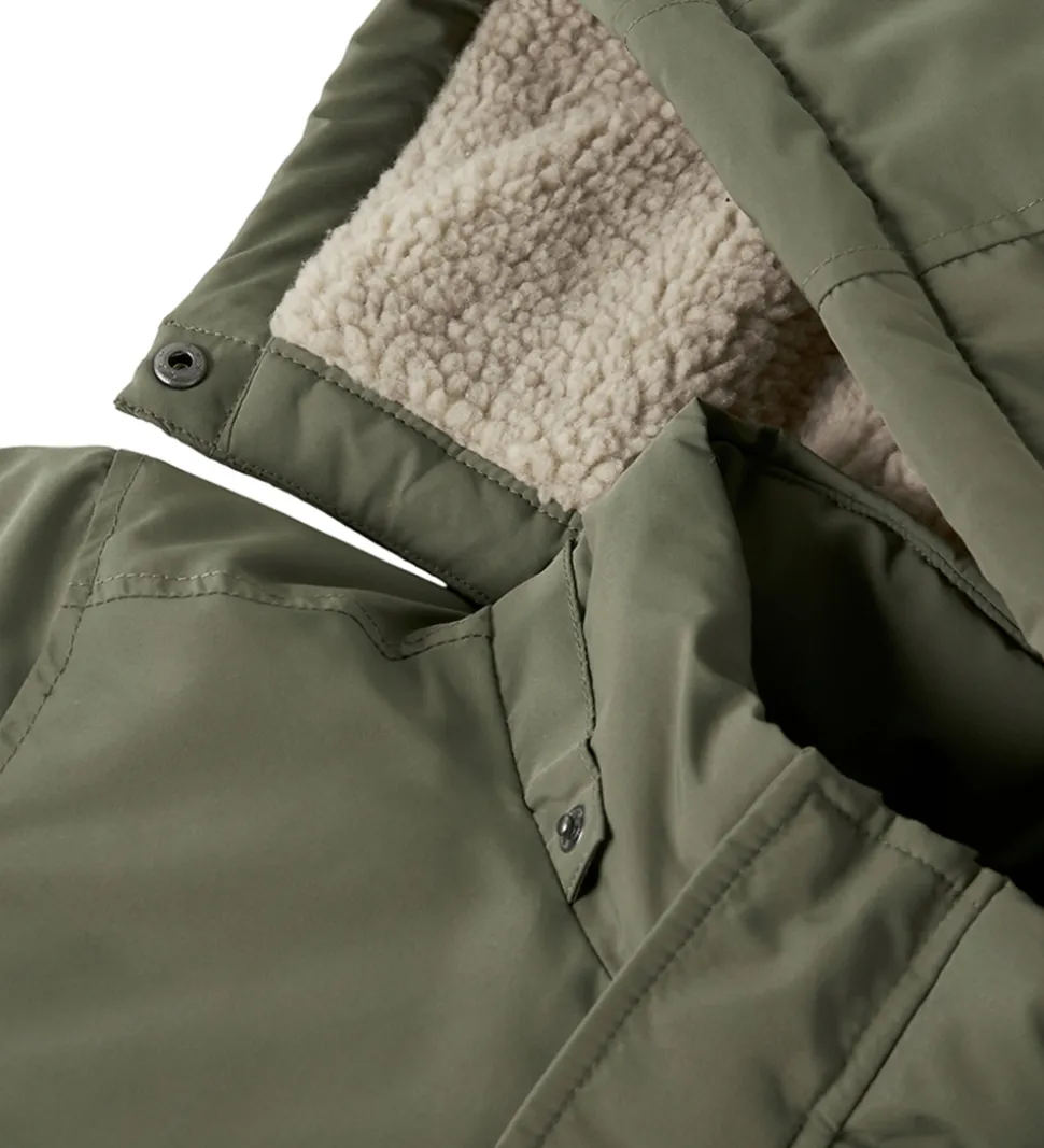 Stilfuld Name It vinterjakke i en flot olivengrøn nuance og med for af beige teddyfleece. Vinterjakken har en praktisk hætte og rummelige lommer, der gør den både funktionel og moderne. Ærmerne har snefang og ribkanter. Name It vinterjakkenjakken er ideel til de kølige årstider.