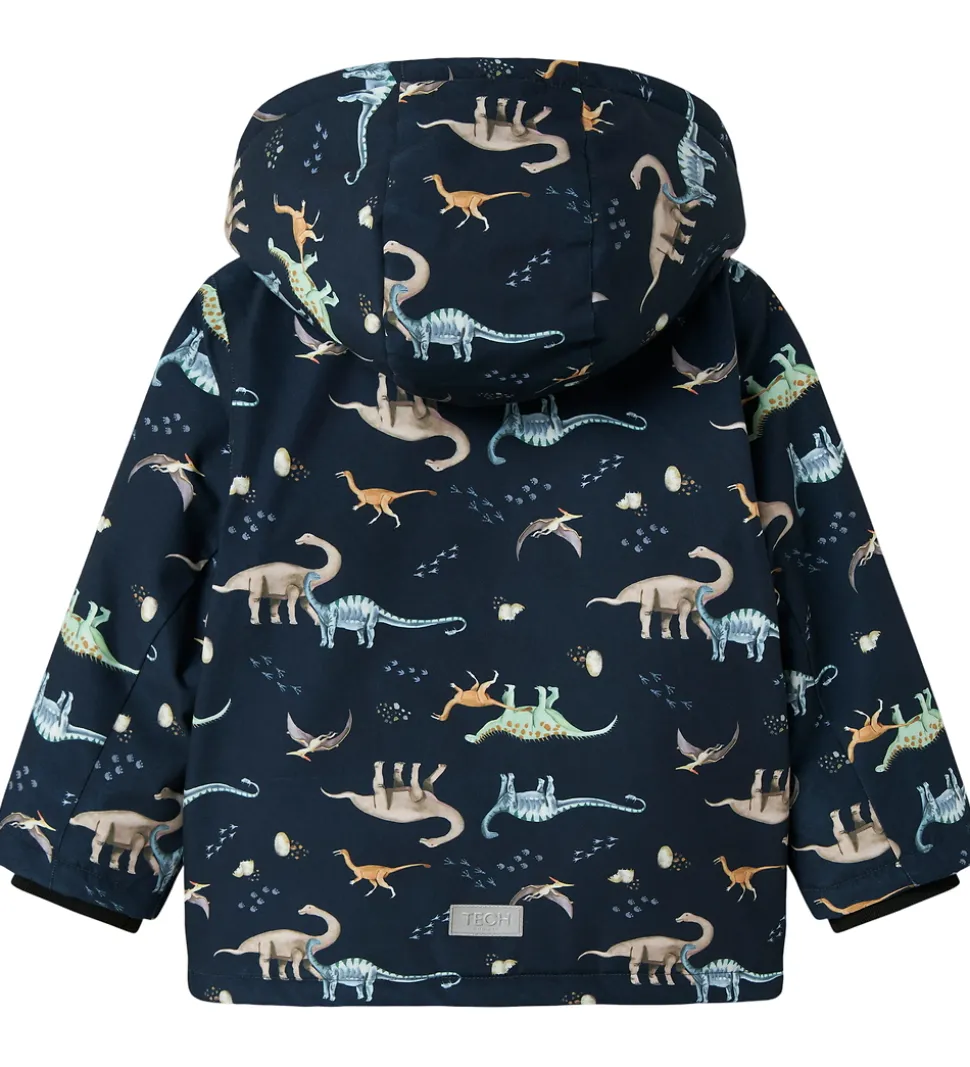 Flot Name It vinterjakke i navyblå med et farverigt alloverprint af dinoer. Vinterjakken har velplacerede reflekspipings og reflekser.