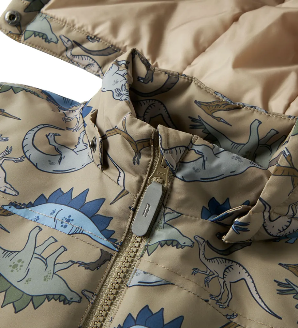 Sej Name It vinterjakke med et spændende dinosaurprint i blå, grønne og brune nuancer på en beige baggrund.