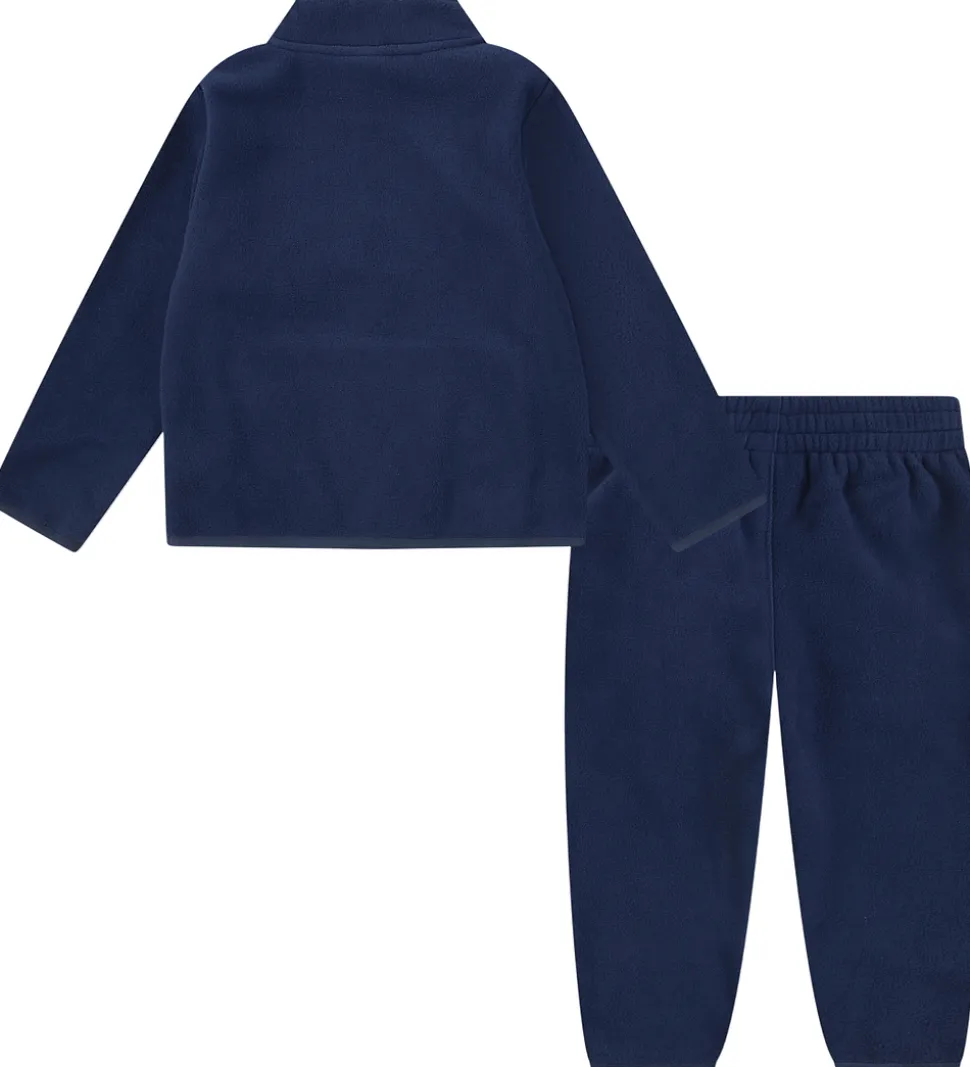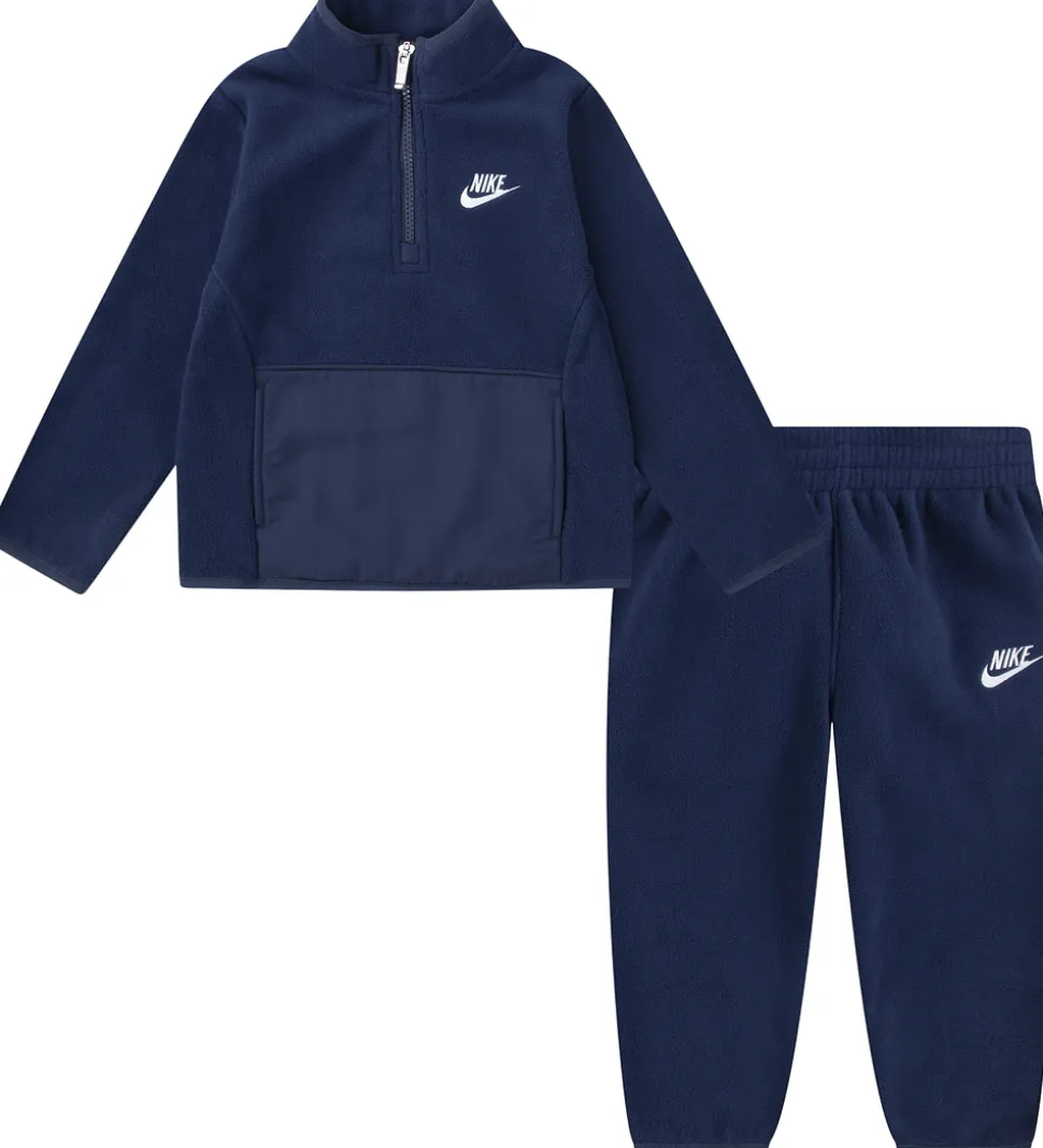 Stilrent Nike fleecesæt i navy bestående af en fleecetrøje og et par fleecebukser. Fleecetrøjen har en praktisk høj hals og lange ærmer. En lynlås fortil gør det nemt at åbne og lukke. Fleecetrøjen har en rummelig kængurulomme foran. Fleecebukserne har en bred, elastisk talje og en fast kant ved anklerne, som holder bukserne på plads.