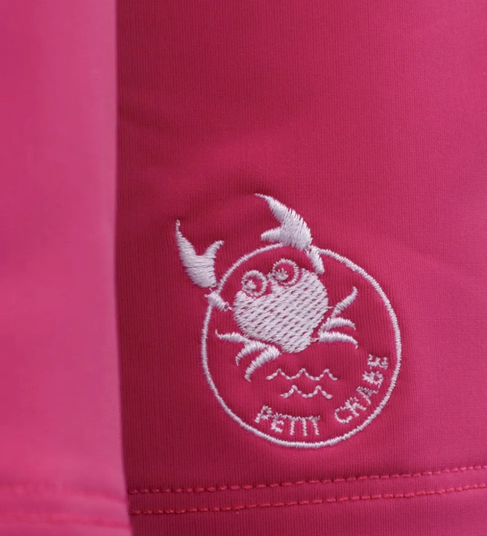 Lækker Petit Crabe badebluse i en dyb rosa med et broderet logo nederst. Badeblusen har lange ærmer med flæser henover skuldrene, samt en høj hals.