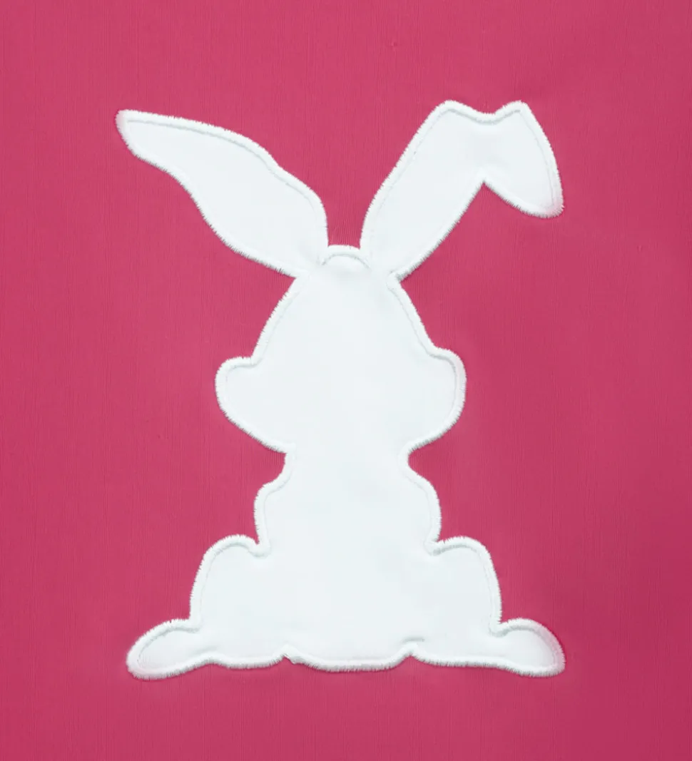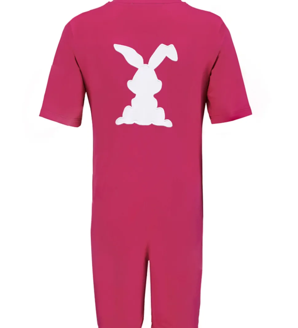 Smart Petit Crabe badeheldragt i en dyb rosa med en stor, hvid kanin på ryggen.