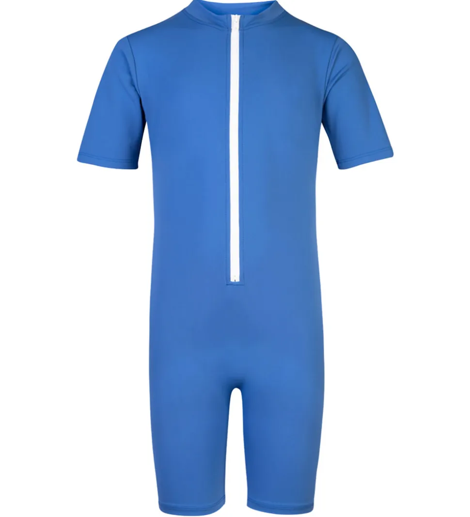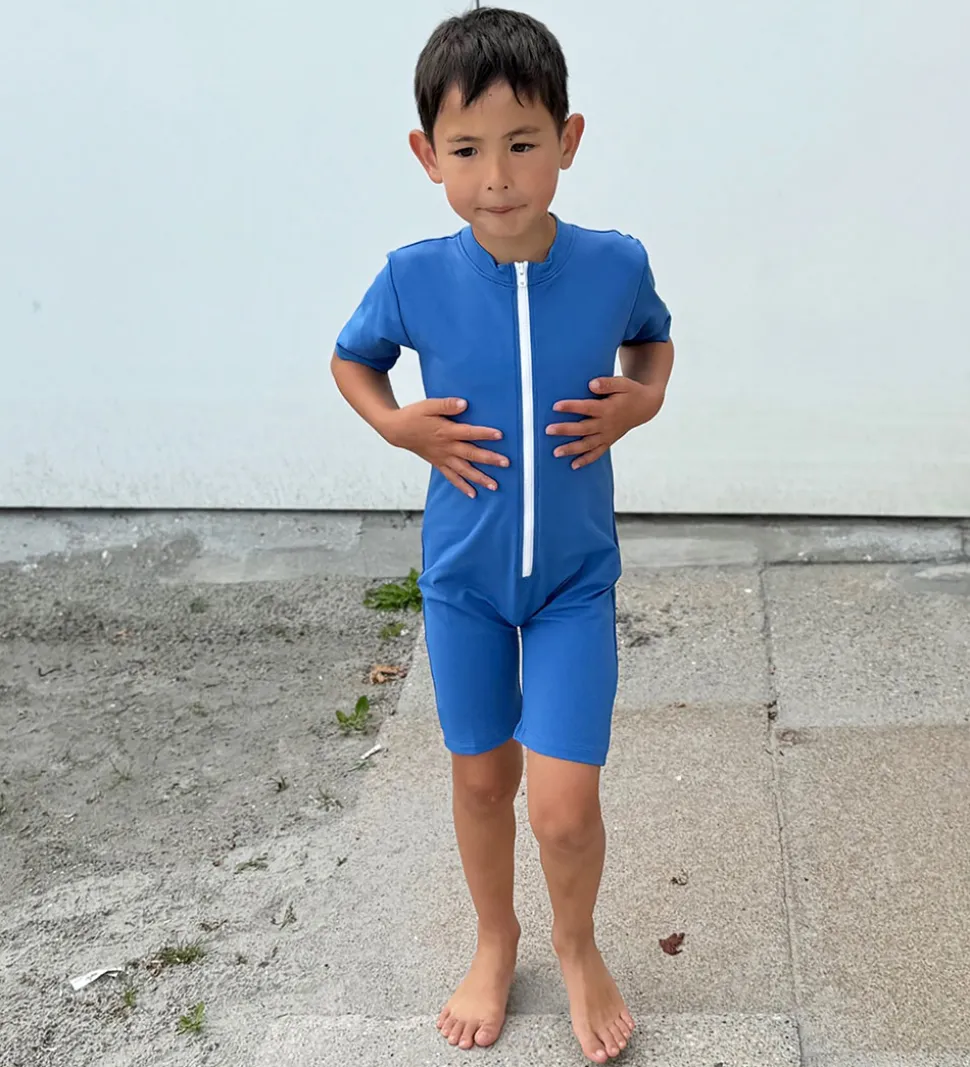 Petit Crabe badeheldragten har korte ærmer og ben, samt en høj hals. Dragten åbnes på fronten med en lynlås, med indvendig vindstolpe, så den ikke generer huden.