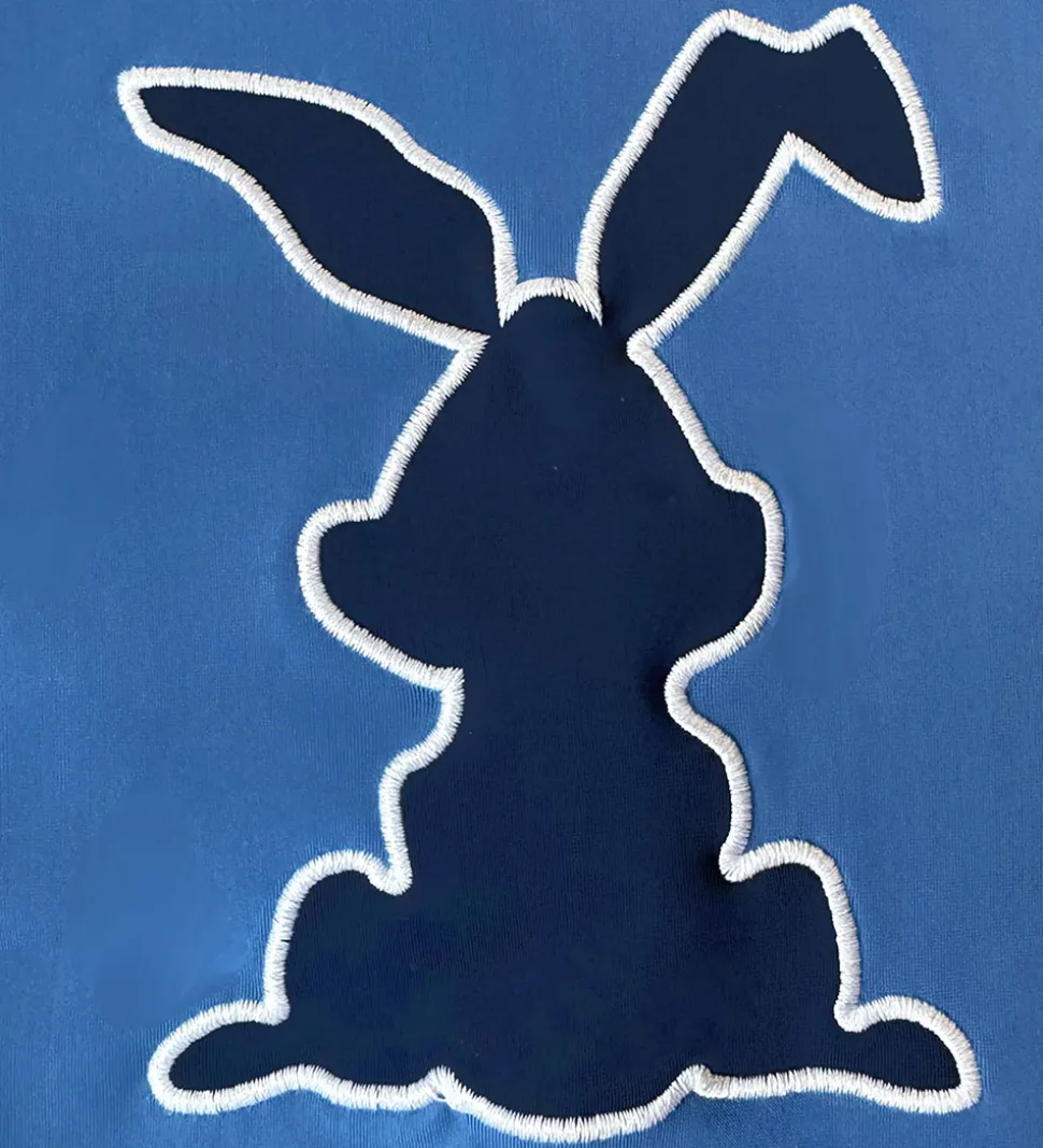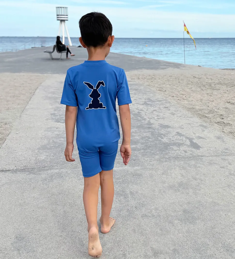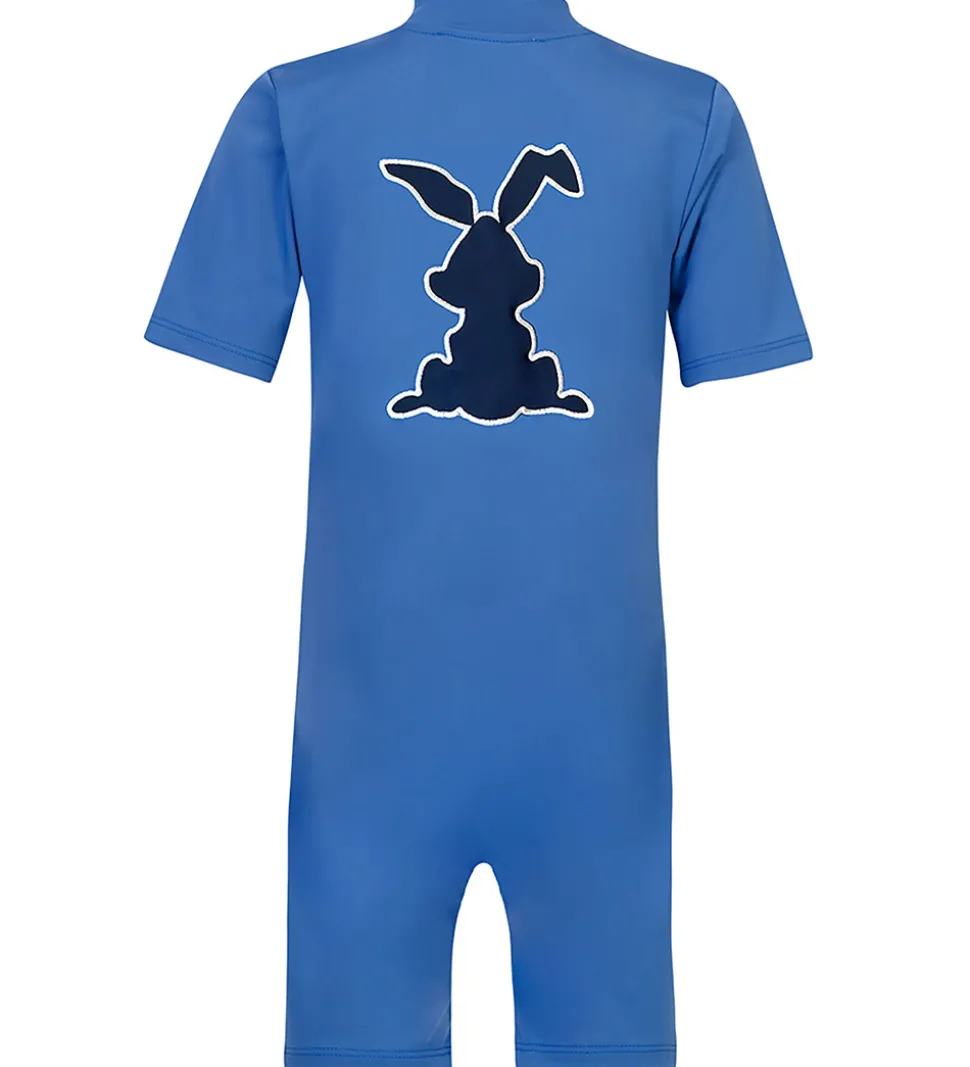 Smart Petit Crabe badeheldragt i blå med en stor, navy kanin på ryggen.