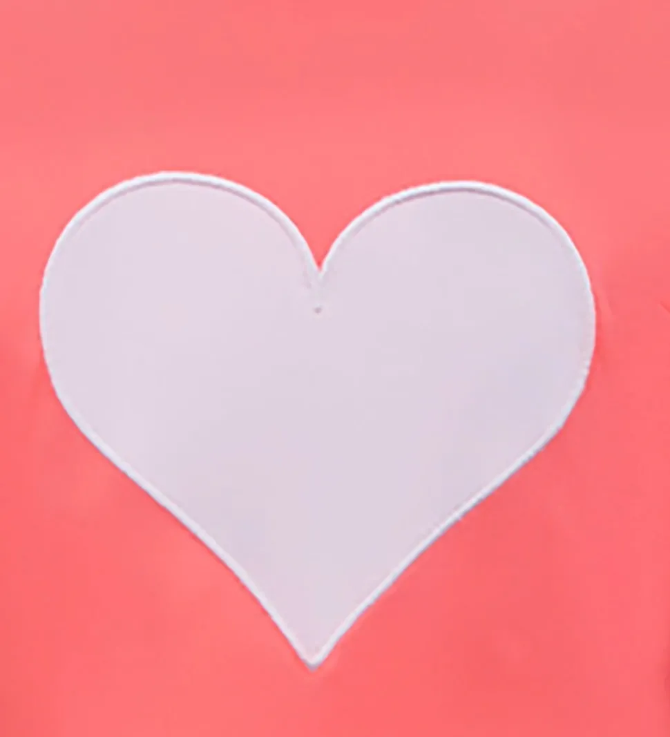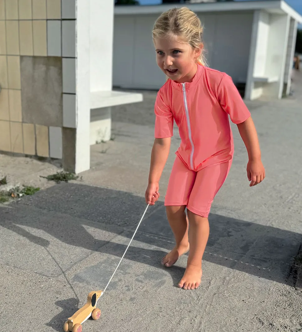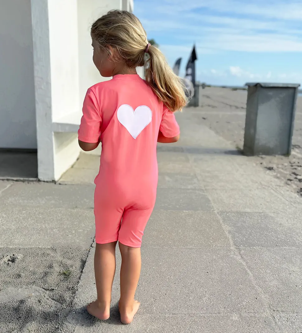 Smart Petit Crabe badeheldragt i koral med et stort, hvidt hjerte på ryggen.