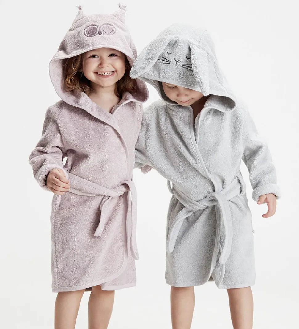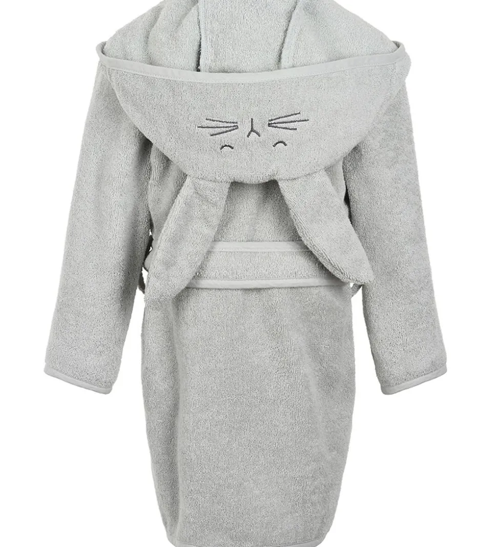 Fin Pippi Baby badekåbe i grå med en fastsyet hætte udformet som en kanin med store ører.