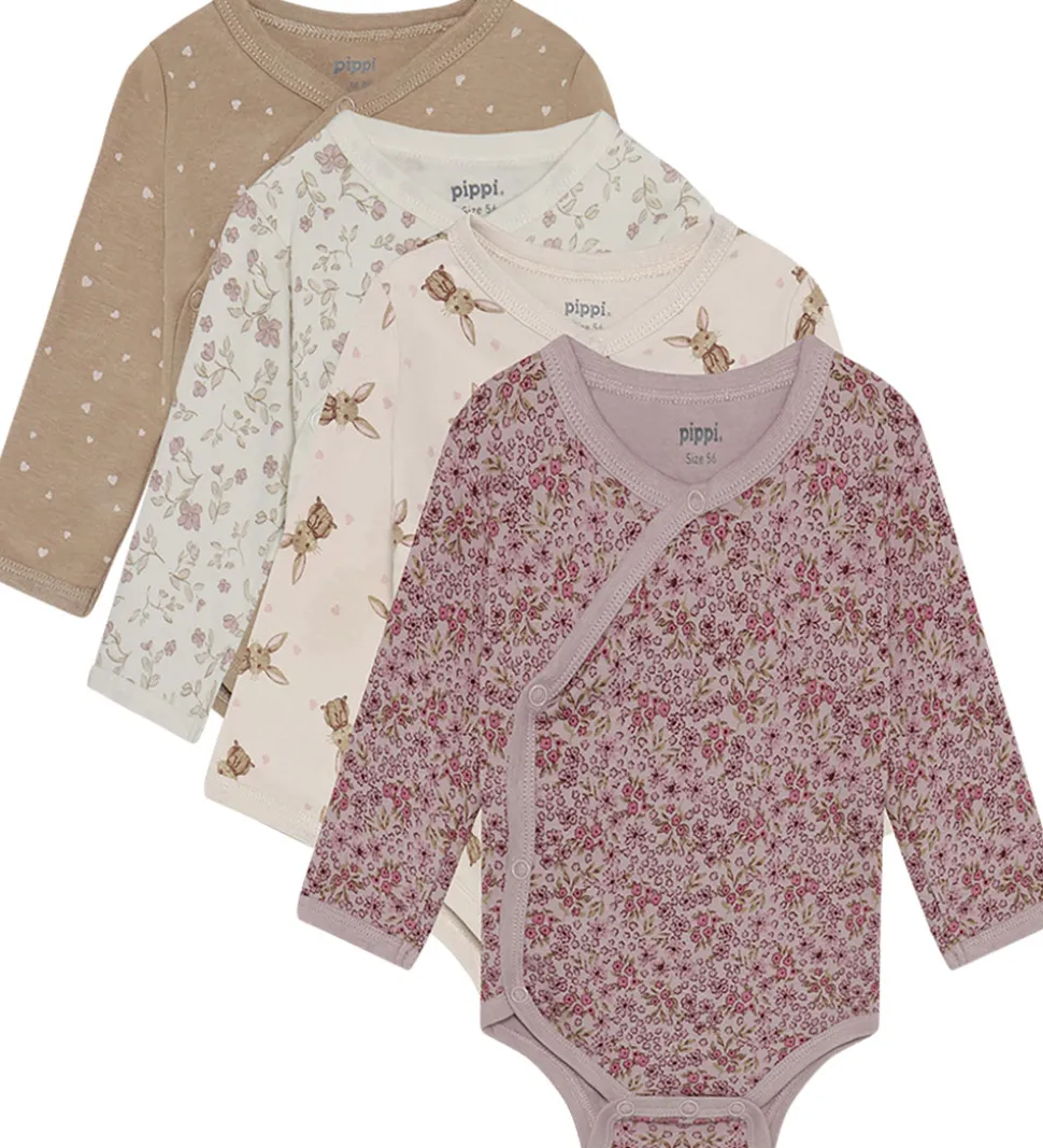 Flotte Pippi Baby bodyer solgt i en 4-pak med følgende designs: