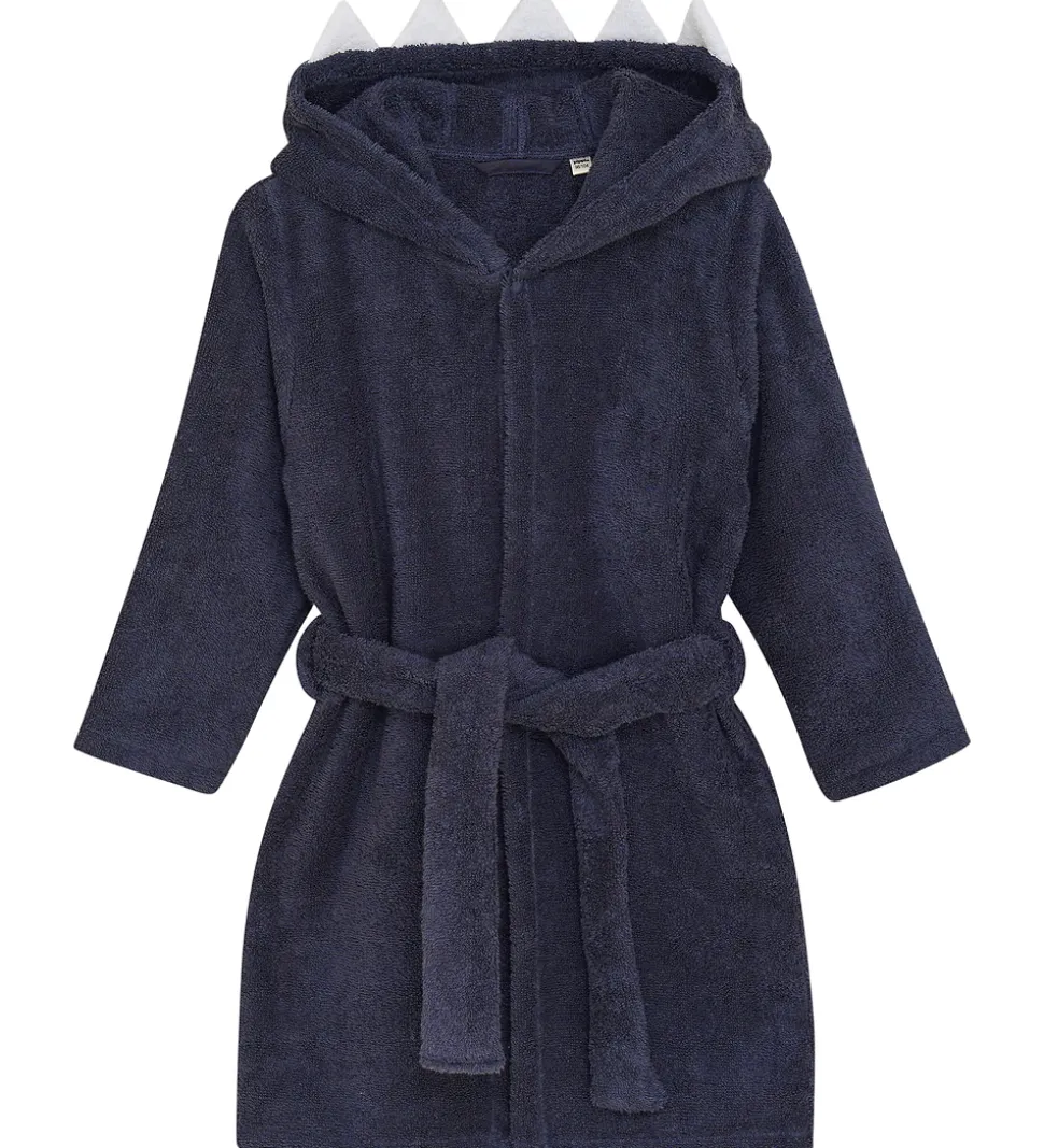 Fin Pippi badekåbe i mørkeblå med en fastsyet hætte udformet som en haj med store tænder.