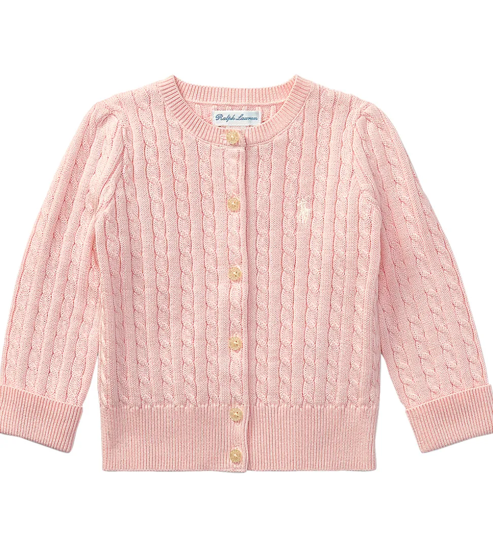 Sød Polo Ralph Lauren cardigan i lys rosa i en strikket bomuldskvalitet med et flot, snoet mønster. Fortil i venstre side er der broderet et lille, hvidt logo.