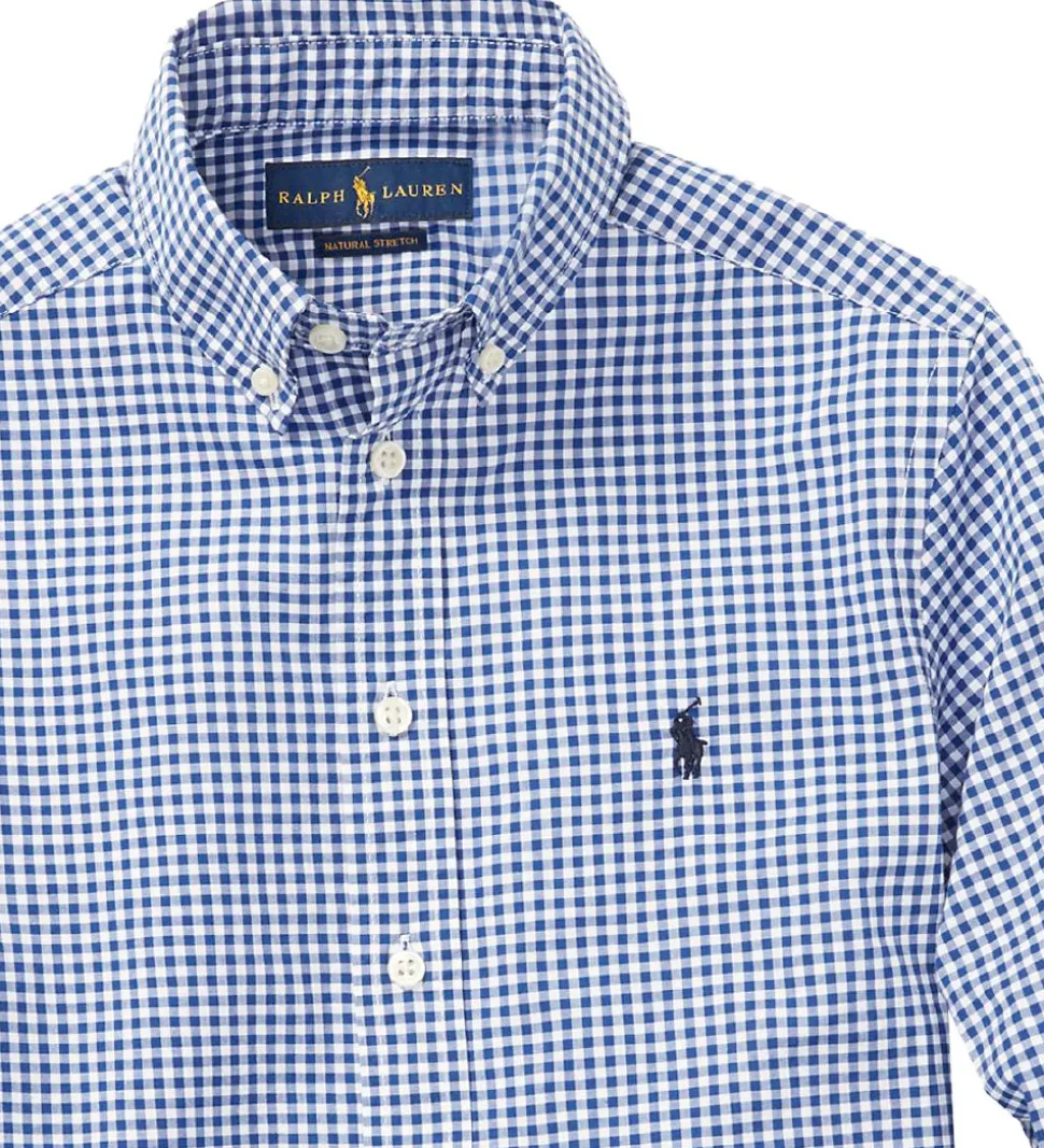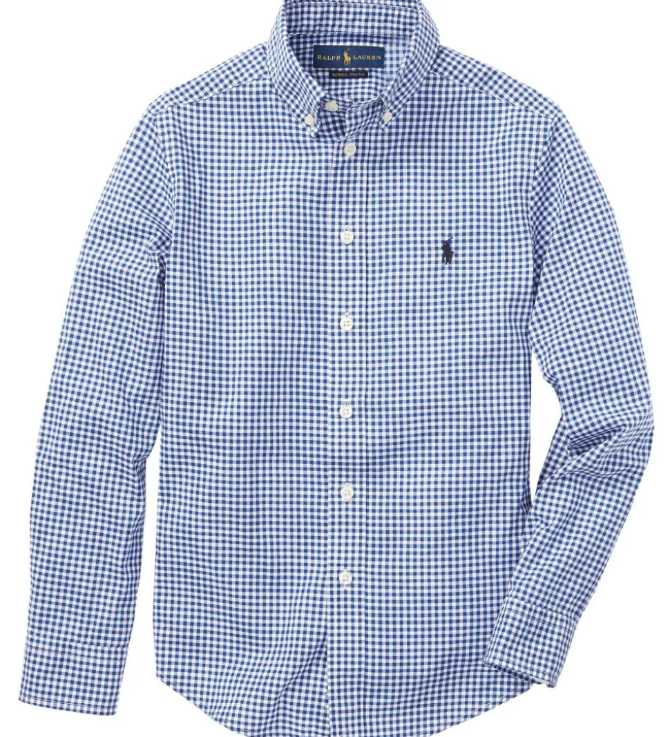 Polo Ralph Lauren skjorten har lange ærmer med brede kanter, og de har to manchetknapper. Skjorten har en klassisk krave, hvor fliperne bliver holdt på plads med en lille, hvid knap i hver spids, og skjorten åbnes med hvide knapper fortil.