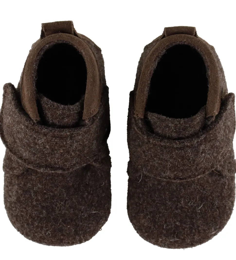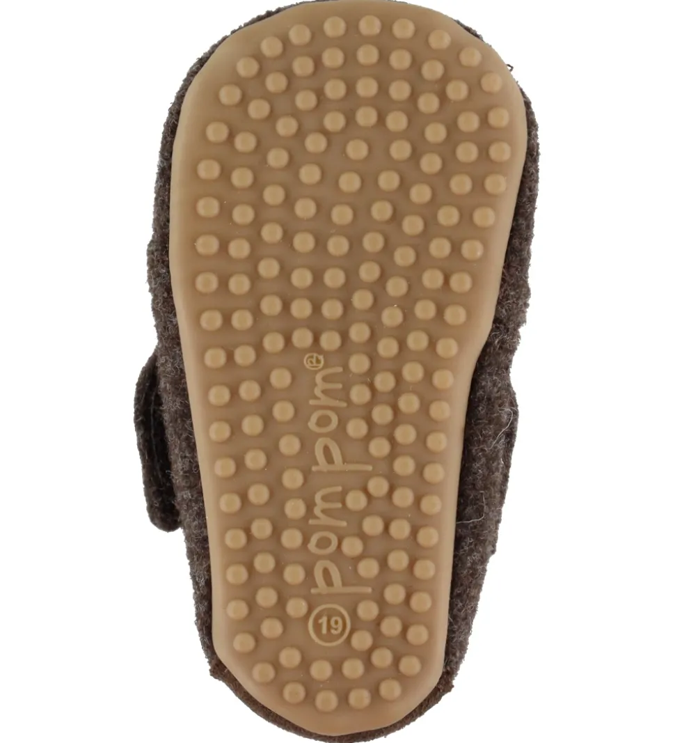 Smarte Pom Pom hjemmesko i mørkebrunt uld, med en fin detalje af brunt ruskind på hælen.