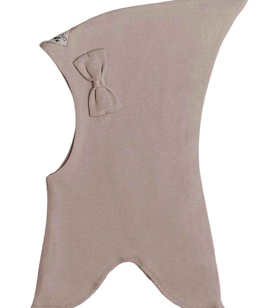 Sød Racing Kids elefanthue i lysebrun med en dekorativ sløjfe på venstre side og en logoapplikation på toppen.