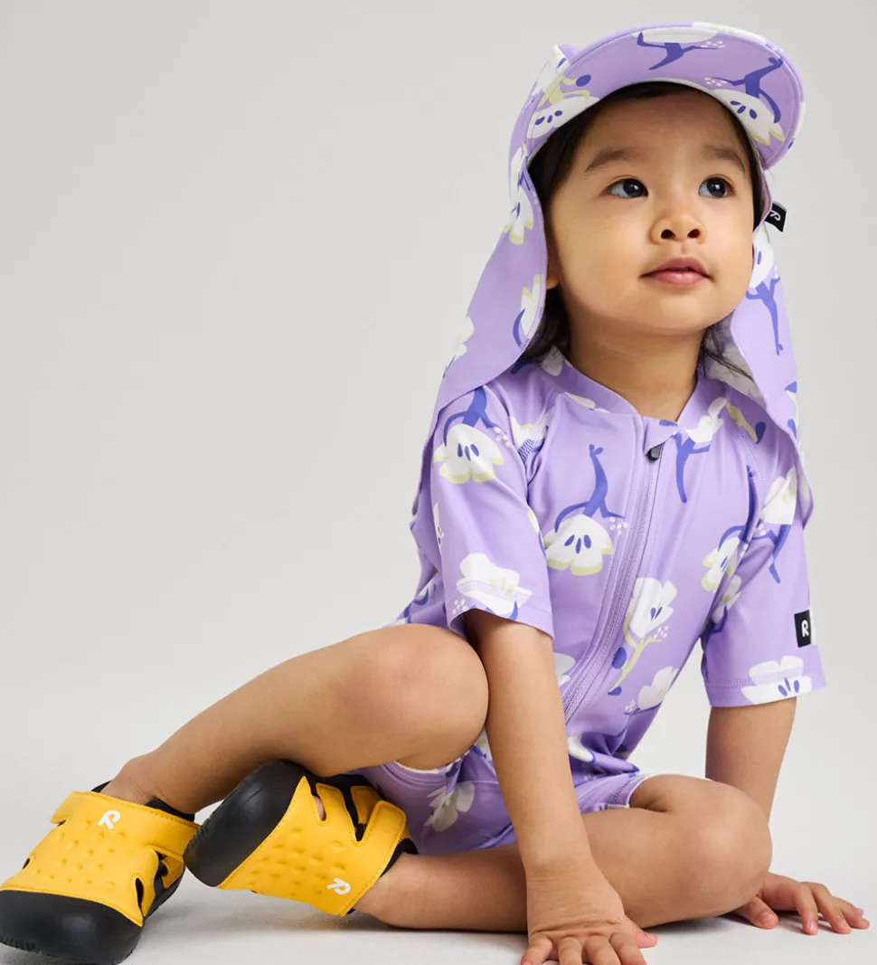 Lækker Reima badeheldragt i en lys lilla med et abstrakt blomstermotiv, der tilføjer et legende touch. Det er en komfortabel og praktisk løsning til vandleg.