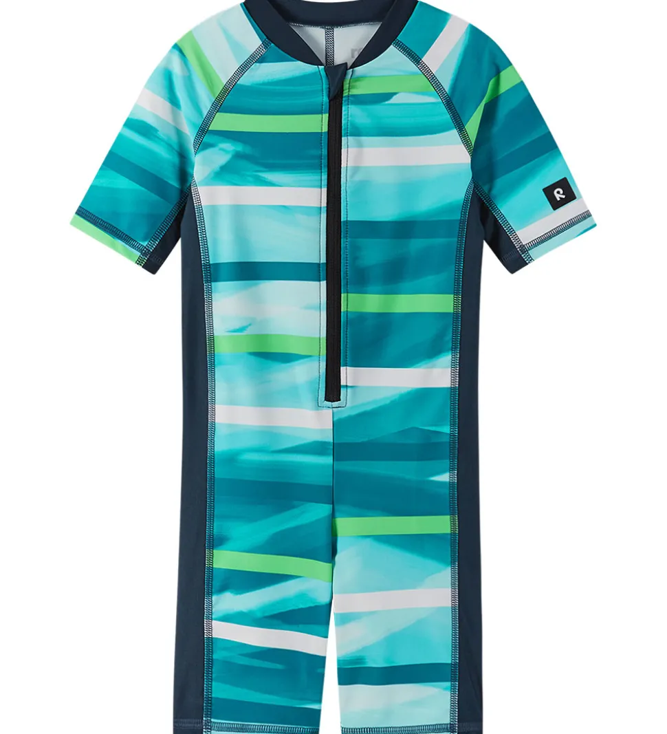 Lækker Reima badeheldragt med striber i blå, hvide og grønne nuancer.