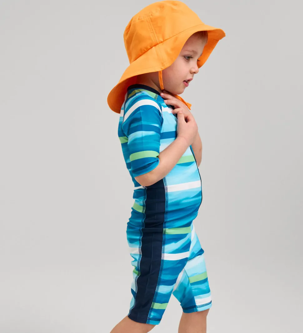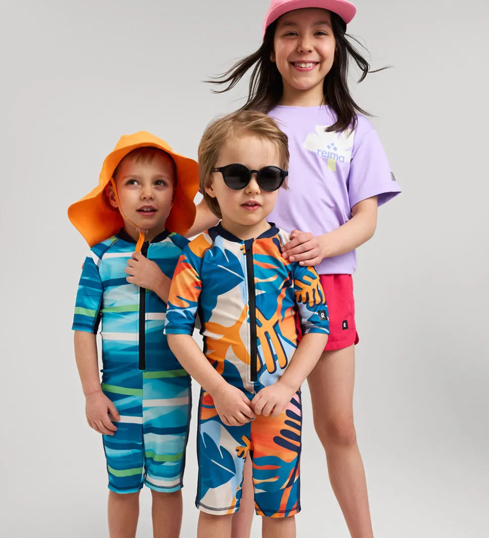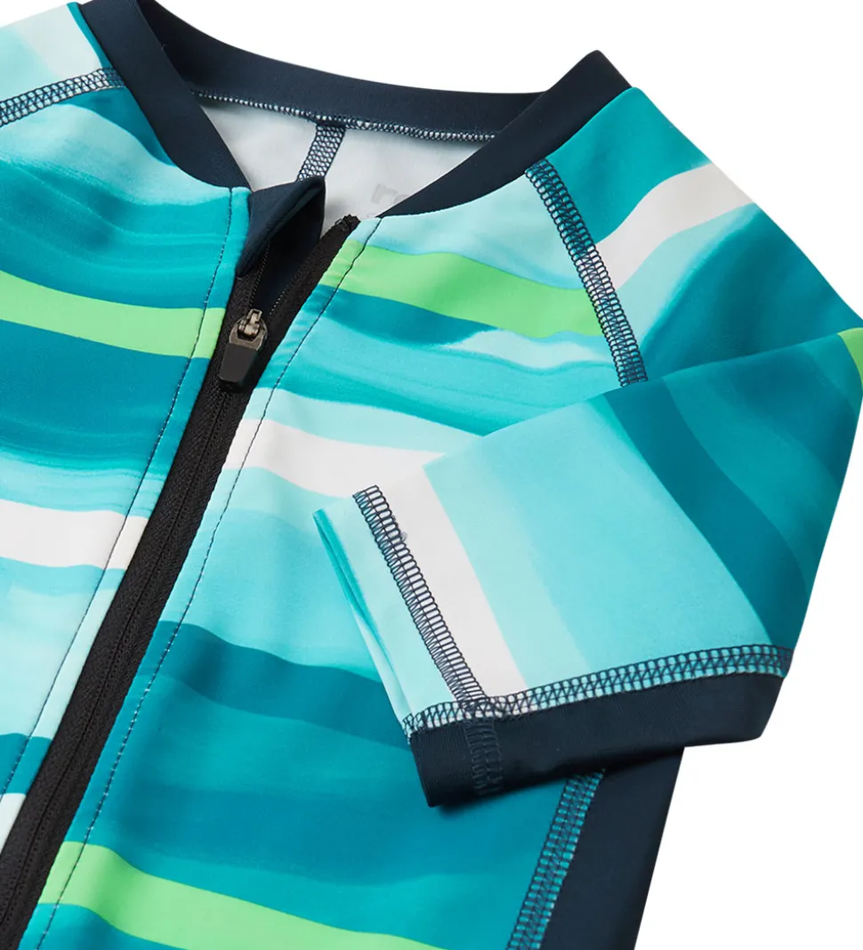 Reima badeheldragten har korte ærmer og ben. Den åbnes på fronten med en lynlås med hagebeskytter og indvendig vindstolpe.