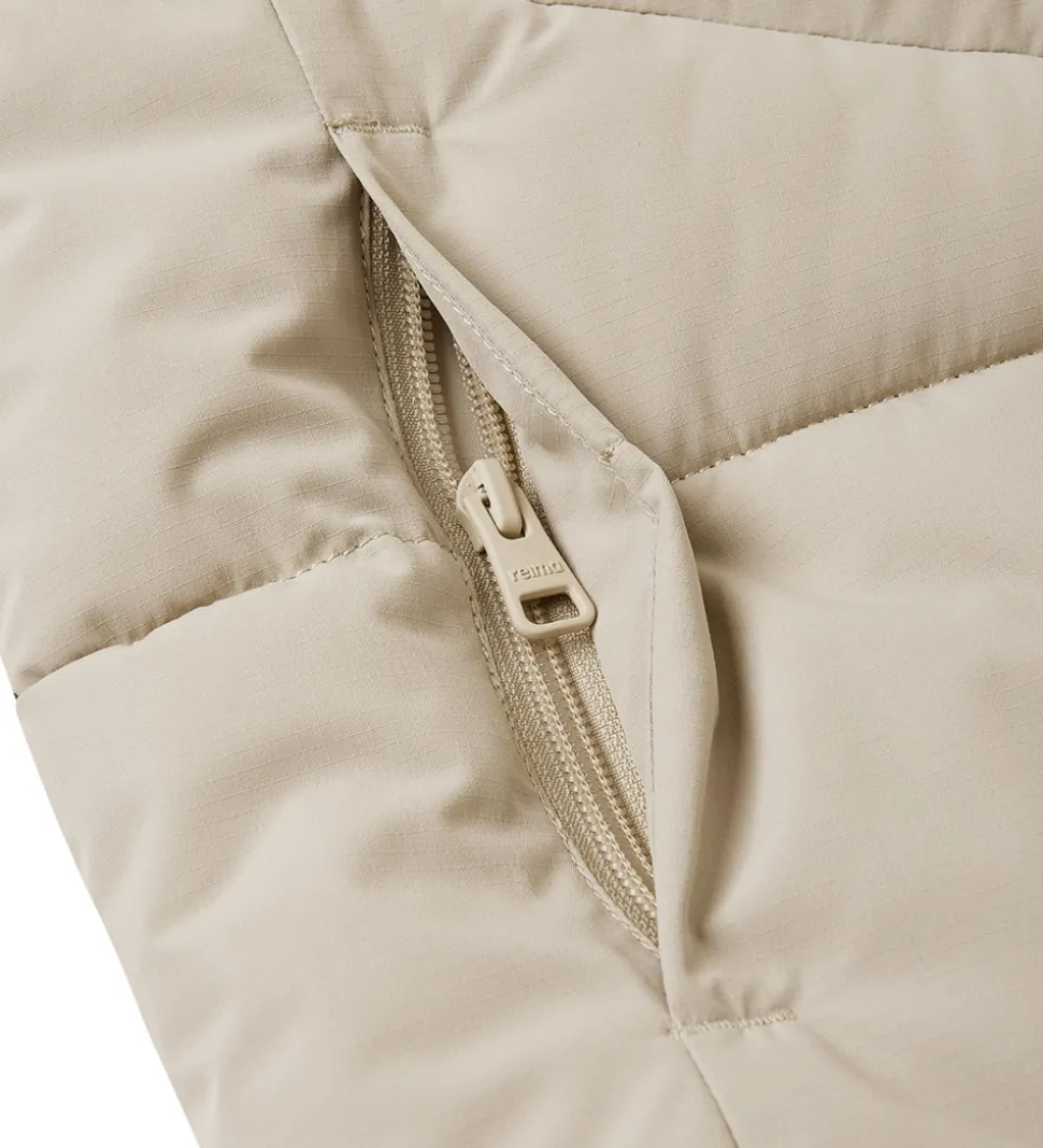 Lækker Reima dynefrakke i ensartet beige med vandrette syninger.