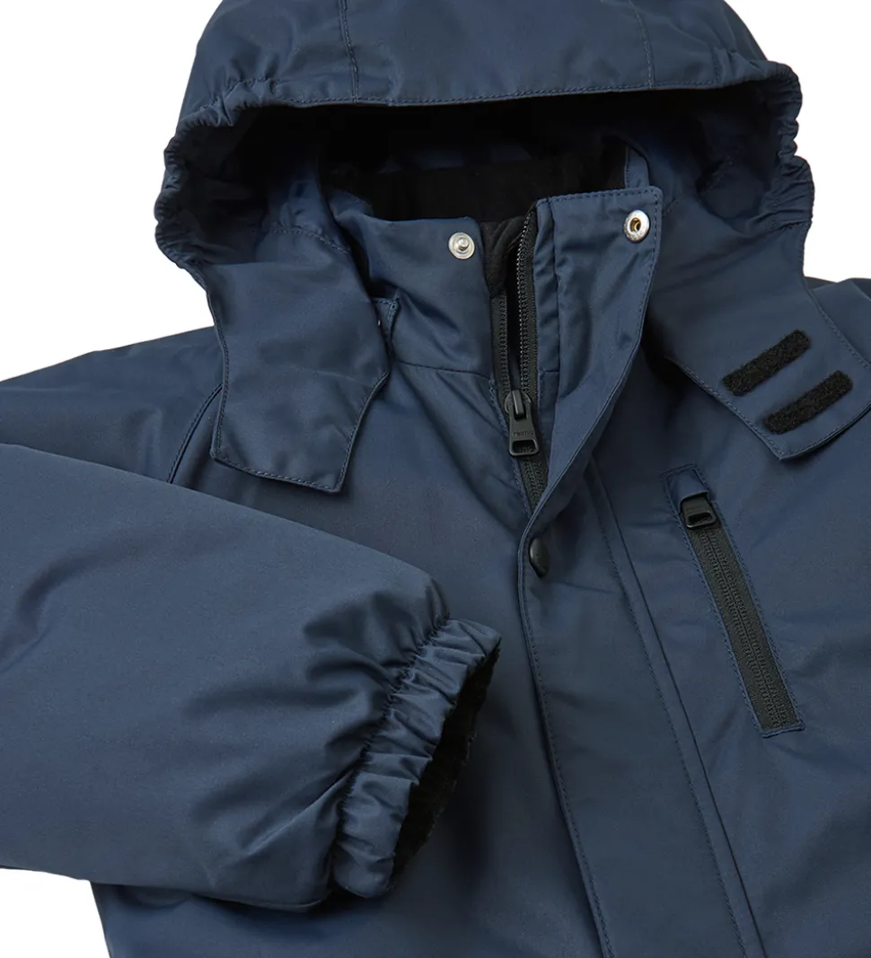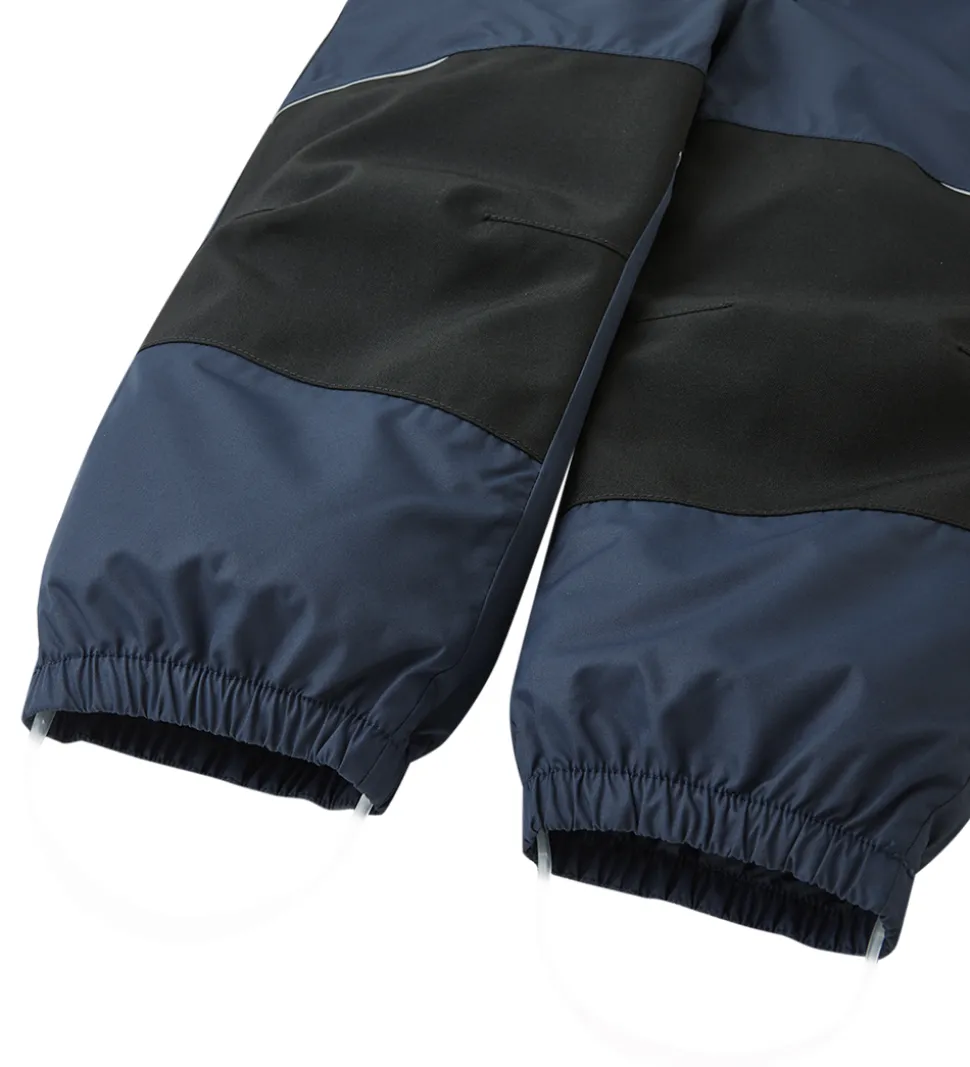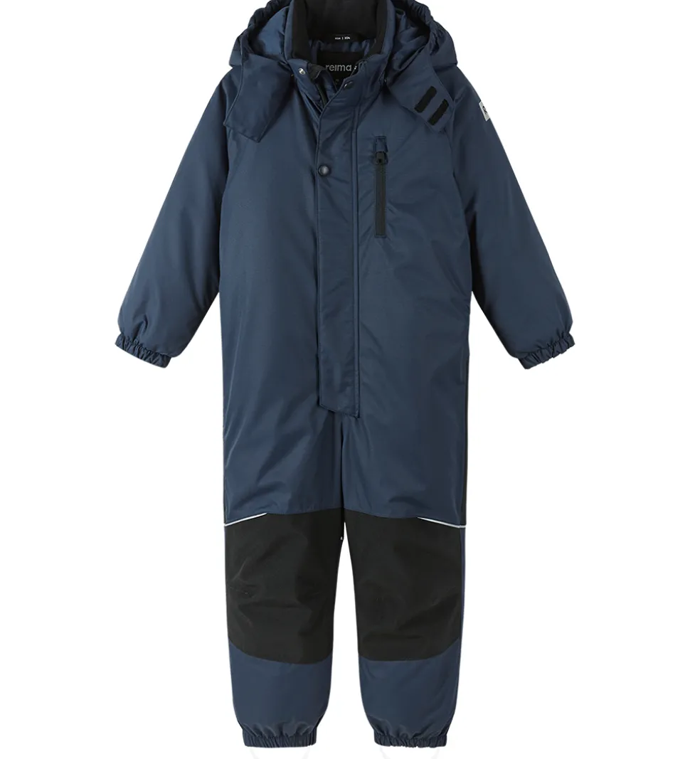 Lækker Reima flyverdragt i navyblå med sorte forstærkninger på knæ og siddeområde.