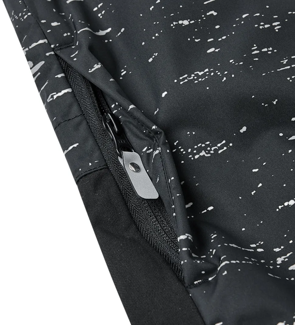 Reima flyverdragten har en aftagelig hætte med elastikkanter i siderne, som sidder fast med skjulte trykknapper, og den lukkes foran hagen med velcro. Ærmerne har fleeceforede elastikkanter, og buksebenene har elastikkanter og aftagelige, justerbare gummistropper til at sætte under støvlerne.