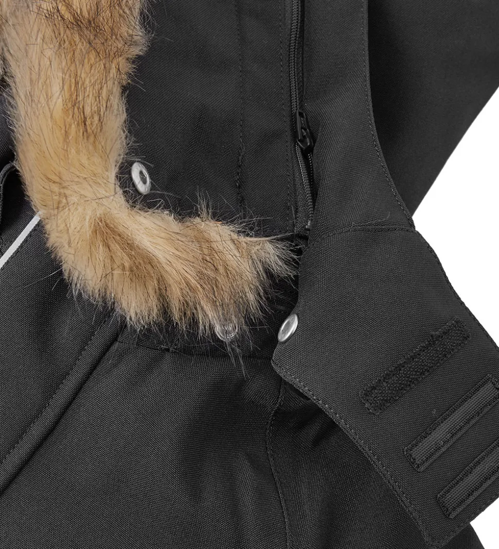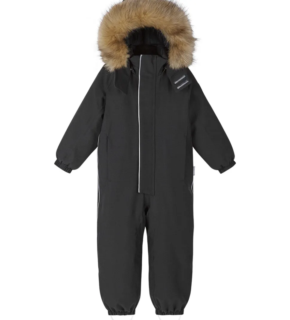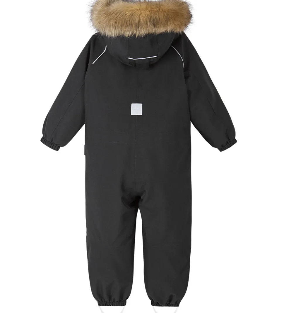 Fin Reima flyverdragt i ensfarvet sort, og hætten har en flot kant af imiteret pels.