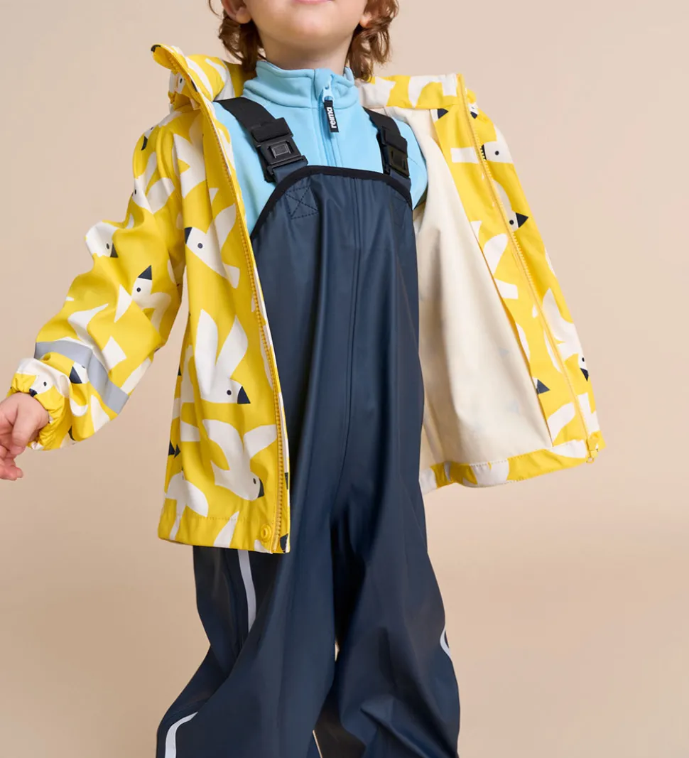Flotte Reima regnbukser med seler i navyblå og praktiske reflekskanter ned langs siderne.