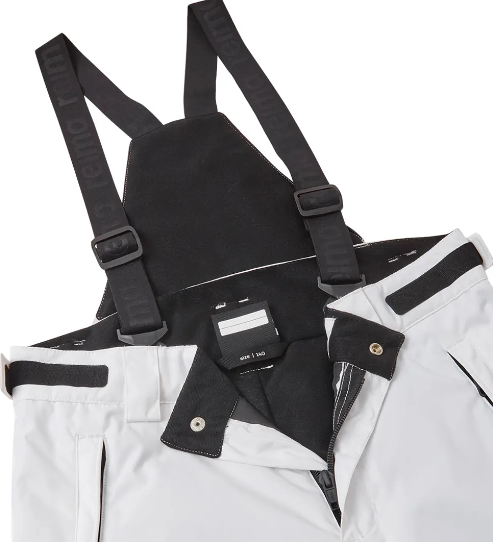 Reima skibukserne har justerbare seler, som lukkes med klikspænder fortil, og er aftagelige med en lynlås i ryggen. I livet er der velcrojusteringer og bæltestropper, og skibukserne åbnes fortil med en tryknap og en lynlås. I siderne er der praktiske lommer, som lukkes med en skjult lynlås, og der er også en ekstra lynlåslomme på højre lår.