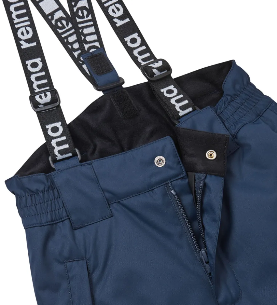 Reima skibukserne har justerbare, aftagelige seler, som fæstnes med velcro, og de samles på ryggen, så de sidder godt fast på skuldrene. I livet er der en bred, fleeceforet elastikkant, og skibukserne åbnes fortil med en tryknap og en lynlås. I højre side er der en lomme, som lukkes med en skjult lynlås.