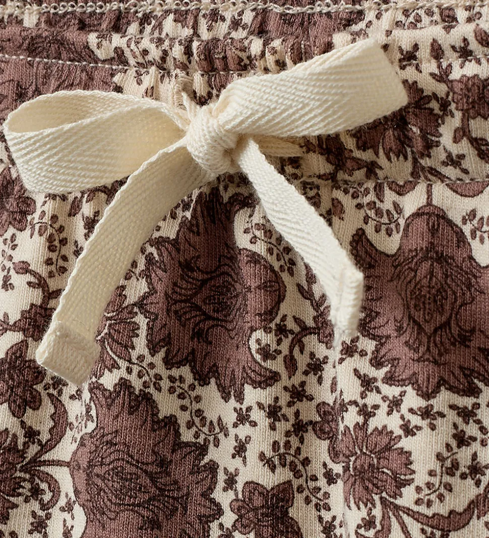 Stilfulde bukser fra Sofie Schnoor, dekoreret med et detaljeret blomstermønster i mørkerosa og beige nuancer. Bukserne har en elastisk talje med snører i fronten, hvilket giver et justerbart fit. Buksebenene afsluttes uden ribkanter for et mere afslappet look.