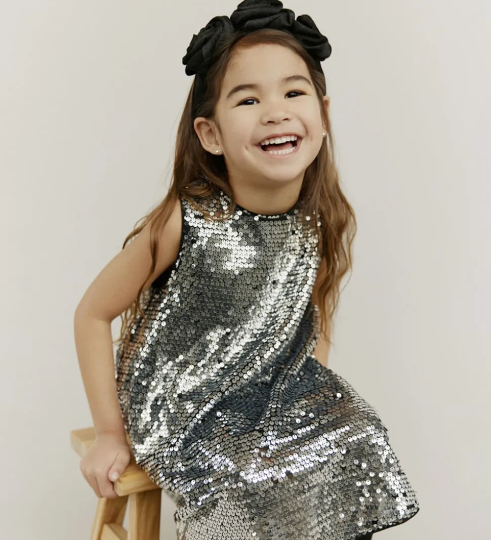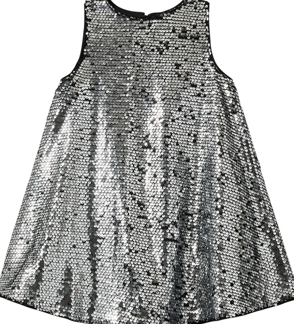 Glimrende Sofie Schnoor kjole med et væld af sølvpailletter, der dækker hele kjolens overflade. Sofie Schnoor kjolen har et ærmeløst design og en rund halsudskæring, som giver den et let og elegant udtryk.