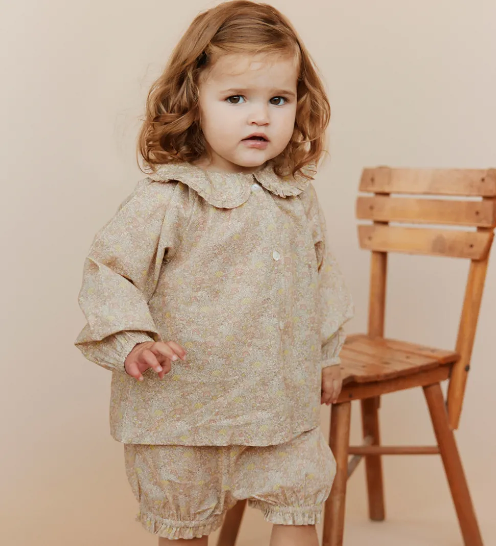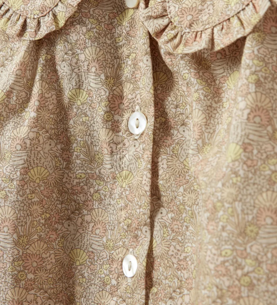 Elegant Sofie Schnoor skjorte i en beige nuance med et delikat blomsterprint. Sofie Schnoor skjorten har lange ærmer og en smuk, flæsedetaljeret krave, der giver et fint og stilfuldt udtryk.